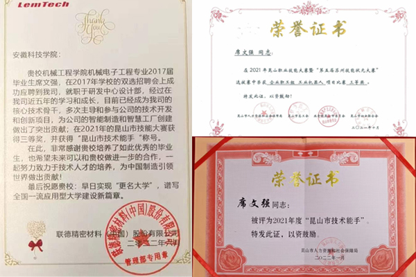日前,总部位于江苏省昆山市的联德精密材料(中国)股份有限公司向开云官方注册发来热情洋溢的工作喜报,“贵校机械工程学院机械电子工程专业2017届毕业生席文强,在2017年学校的双选会上成功应聘到我司,就职于研发中心设计部,经过在我司近五年的学习和成长,目前已成为我司的核心技术骨干,多次主导和参与公司的技术开发和创新项目,为公司的智能制造和智慧工厂创建作出了突出贡献;在2021年的昆山市技能大赛上荣获三等奖,并获得‘昆山市技术能手’称号。在此,非常感谢贵校培养了如此优秀的毕业生,也希望未来可以和贵校做进一步的合作,一起努力致力于技术人才的培养,为中国制造引领世界做出贡献!最后祝愿贵校:早日实现‘更名大学’,谱写全国一流应用型大学建设新篇章。”