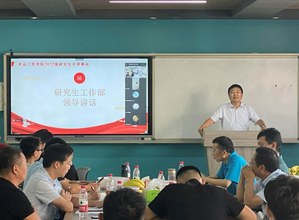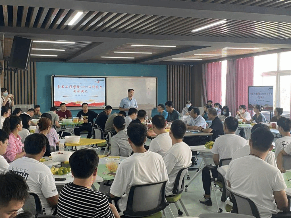 9月7日下午,食品工程学院2022级研究生开学典礼在智慧教室求知楼B309举行。本次典礼采用线上与线下相结合的方式进行。校党委研究生工作部部长张春雨、食品工程学院党委书记付光玺、院长杜传来、副院长翟立公、副院长郑海波、研究生秘书彭钢、2022级研究生辅导员桑宏庆、全体研究生导师及2022级全体研究生参加。典礼由学院党委副书记、纪委书记王广良主持。