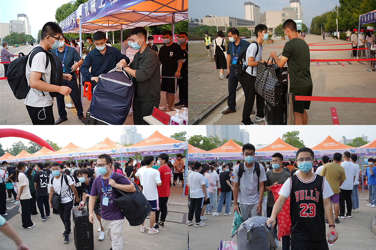 为配合做好疫情防控工作,参与迎新的所有师生一律佩戴口罩,协助维护报到现场秩序。迎着清晨的阳光,迷彩社团的退役大学生们早早地就在报到点等待新生的到来。在迎新现场,机械学子主动在志愿者队伍中排起了长龙,接过新生已消杀的各种行李,引导新生完成人脸识别、检录报到、领取宿舍钥匙和校园一卡通等手续,并陪同新生一同前往宿舍,将行李送到床铺边。