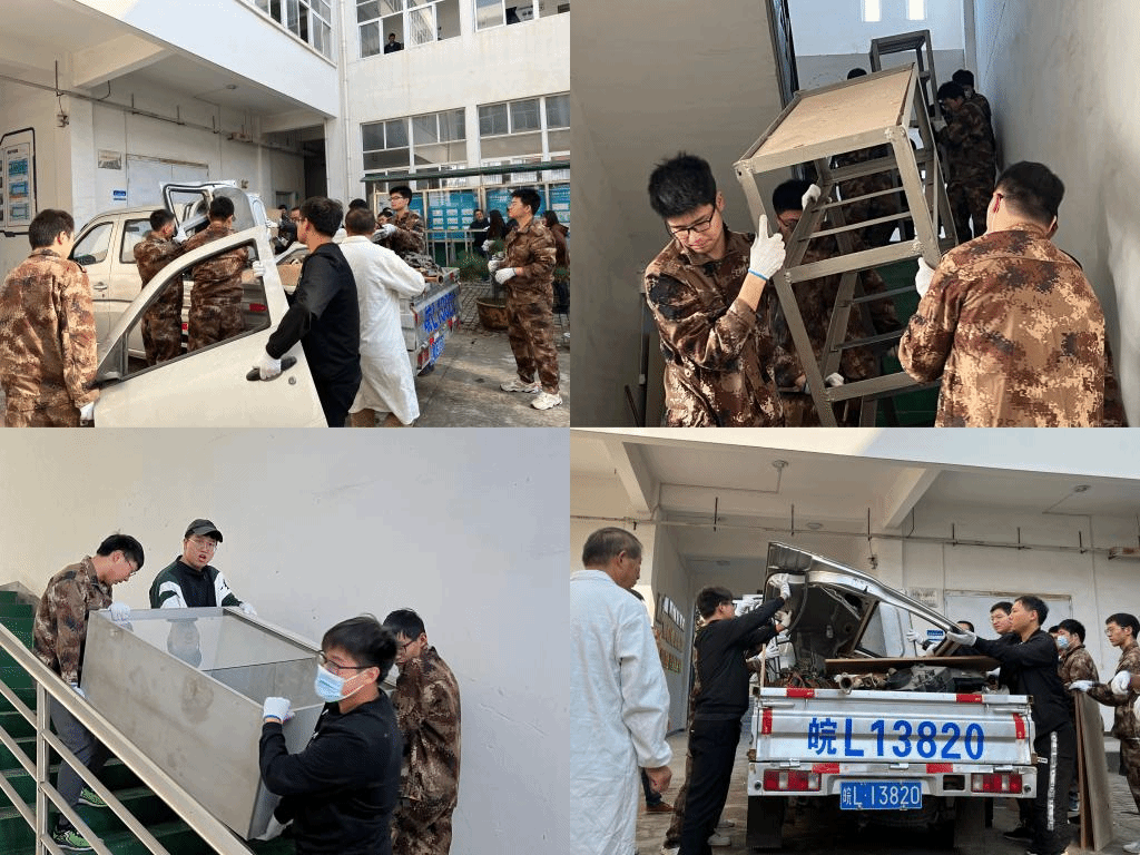 根据学院统一安排,力行楼由司志远、董文彬两位老师带队。活动开始后,师生们纷纷带上手套,男生们或拆装仪器,或你搬我抬;女生们也不甘示弱,有针对性地对实验桌椅板凳等物品做好搬运前的保护措施,劳动现场一片热火朝天。与此同时,工程训练中心更是一派热闹景象,同学们在范新波、洪腾蛟两位老师的带领下,将铁架、汽车配件、玻璃柜等物品装上卡车转运到力行楼,将故障诊断设备搬迁至工训中心一体化实训区,农机设备、铸造设备等也陆续搬到了“新家”。