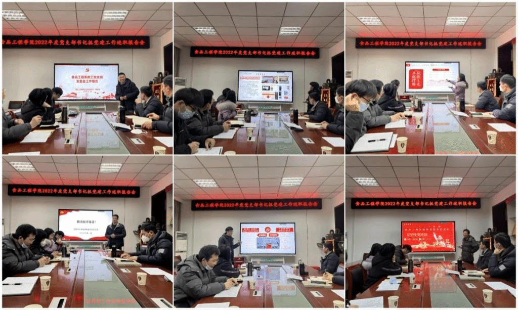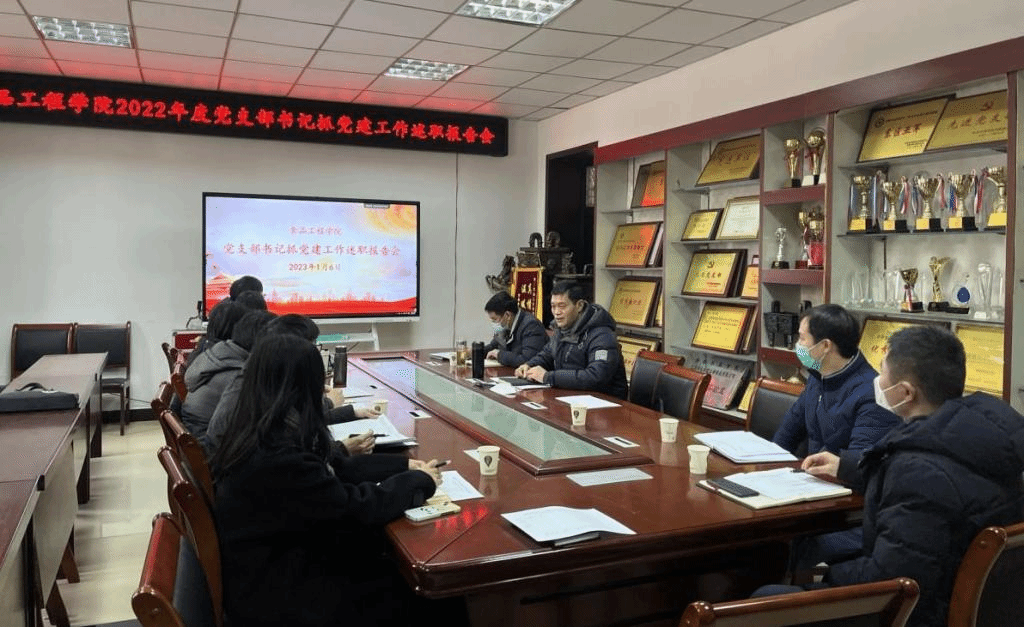 为深入推进基层党支部标准化建设,落实上级党委关于基层党组织书记述职考核的工作要求,激发支部活力,检视基层党支部书记履行职责抓党建总体情况,交流“一支部一特色”做法, 1月6日下午,食品工程学院在学院会议室召开2022年度党支部书记抓党建工作述职报告会。学院党委委员、各党支部书记、教师代表参加会议。会议由学院党委书记付光玺主持。