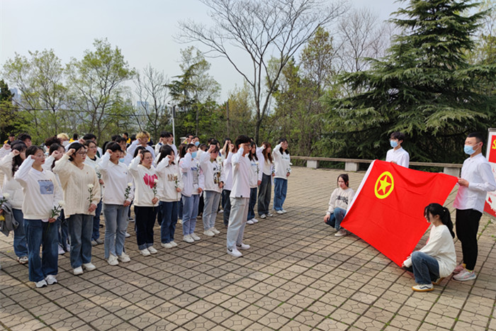 在烈士纪念碑广场,大家整齐肃穆列队,面对高大雄伟的烈士纪念碑,怀着无比崇敬的心情向革命先烈默哀、鞠躬。校优秀共青团员代表、财管213班团支书吕宝财带领在场团员重温入团誓词,进一步坚定理想信念,继承英烈遗志,赓续红色血脉。