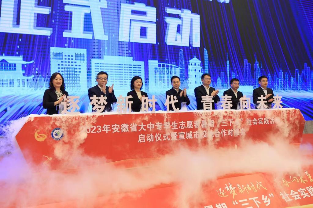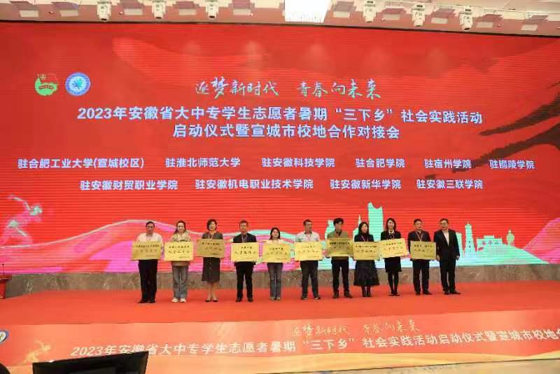 4月24日,2023年安徽省大中专学生志愿者暑期“三下乡”社会实践活动暨宣城市校地合作对接会在宣城举行。宣城市委书记李中、团省委书记陈明生出席活动并致辞。来自长三角100多所高校团委和就业部门负责人参加活动。校团委书记张聪、机械工程学院辅导员张立亮、管理学院辅导员江旭聪应邀出席会议。