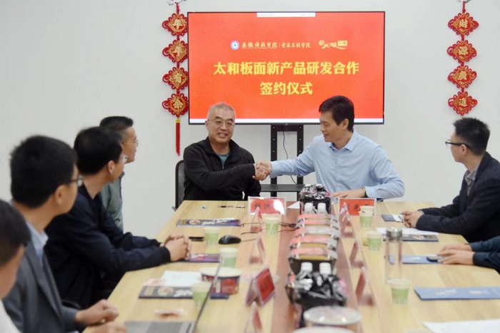 在安徽太板一号食品科技有限公司,付光玺一行与公司董事长胡洪彬、总经理魏继棠深入探讨合作机制。胡洪彬介绍了公司的发展历程、公司研发的太和板面系列产品,并就速食板面加工过程中遇到的技术难题与参会专家进行了深入的探讨。最后双方在太和板面功能性成分分析、板面调料包防腐保鲜、制定速食板面的行业标准等方面达成合作,现场签订了太和板面新产品研发合作协议,举行了开云官方注册食品工程学院大学生实习实训基地揭牌仪式。