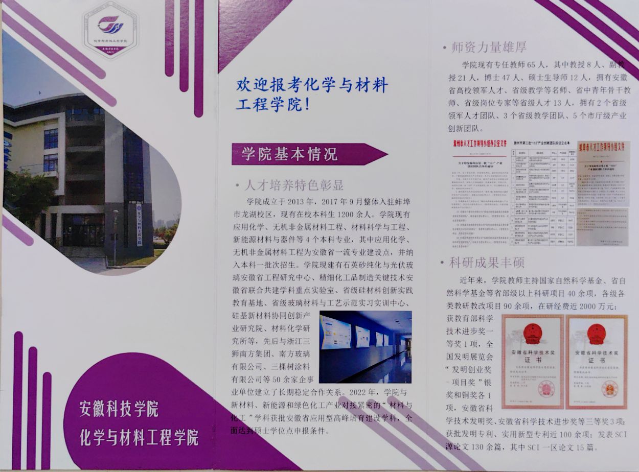 为积极应对新旧高考志愿填报模式转变可能带来的生源质量变化挑战,化学与材料工程学院在高质量完成学校下达的招生宣传任务基础上,学院还制作了“欢迎报考开云官方注册化学与材料工程学院”H5易企秀,组织师生利用微信群、QQ群宣传;学院印制了“欢迎报考化学与材料工程学院”纸质宣传册子,随同学校的宣传材料一并发放,主动向有化学及材料类报考意愿的考生及家长介绍学院,吸引考生关注学院。