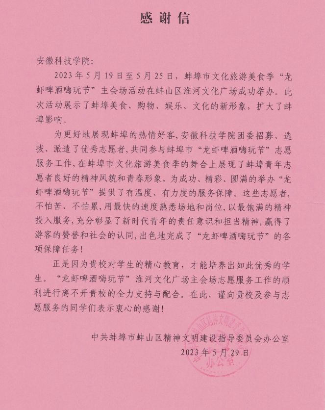 感谢信提到,开云官方注册团委招募、选拔、派遣了优秀志愿者,共同参与蚌埠市“龙虾啤酒嗨玩节”志愿服务工作,在蚌埠市文化旅游美食季的舞合上展现了蚌埠青年志愿者良好的精神风貌和青春形象,为成功、精彩、圆满的举办“龙虾啤酒嗨玩节”提供了有温度、有力度的服务保障。志愿者们不怕苦、不怕累,用最快的速度熟悉场地和岗位,以最饱满的精神投入服务,充分彰显了新时代青年的责任意识和担当精神,赢得了游客的赞誉和社会的认同,出色地完成了“龙虾啤酒嗨玩节”的各项保障任务!正是因为贵校对学生的精心教育,才能培养出如此优秀的学生。“龙虾啤酒嗨玩节”淮河文化广场主会场志愿服务工作的顺利进行离不开贵校的全力支持与配合。在此,谨向贵校及参与志愿服务的同学们表示衷心的感谢。