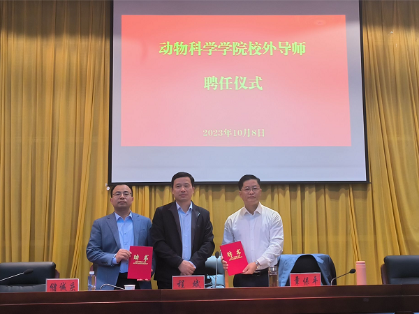 学院首先举行校外导师聘任仪式,特邀上海萌薇生物医疗科技有限公司董事长章保平、上海航厚宠物诊所有限公司总经理储诚庆聘为动物科学学院校外导师。