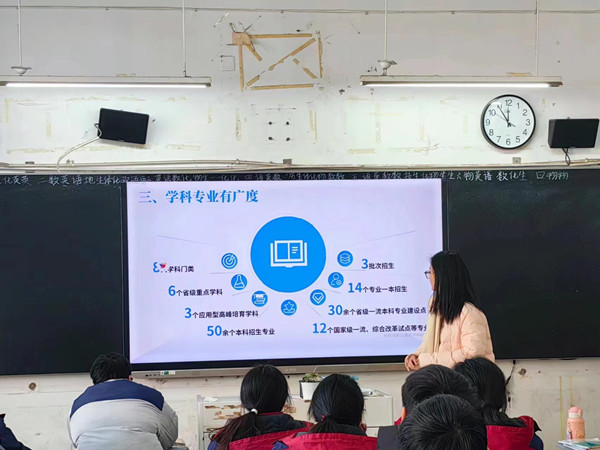 1月18日,邢雨洁带领团队一起回到母校涡阳县第一中学,借助PPT宣讲和互动交流等多种方式,向高中师生全方位介绍了开云官方注册的办学实力、校园环境、文化活动、优秀校友、发展成果等,传播安科声音,展现安科学子风采,扩大安科社会影响力,鼓励广大优秀学子报考安科。