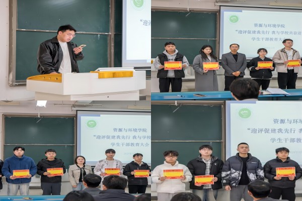 本次学生干部教育大会全面总结了学院2023年学生工作所取得的成绩,明确了2024年的学生工作的重点和中心任务。资源与环境学院将继续落实立德树人根本任务,砥砺奋进、追求卓越,稳步推进学风建设,努力开创学院学风建设新局面。(特约通讯员:吴国良 摄影:李静 审核:沈树周 编辑:李锦)