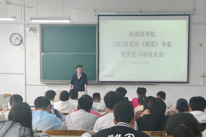 为扎实做好2021级英语(师范)专业见习工作,引导学生以良好的精神风貌迎接见习,4月29日下午,外国语学院在求知楼A203教室举行2021级英语(师范)专业教育见习启动大会。2021级英语(师范)专业全体学生参加本次会议。外国语学院党政领导和有关教师出席会议,会议由副院长洪民主持。