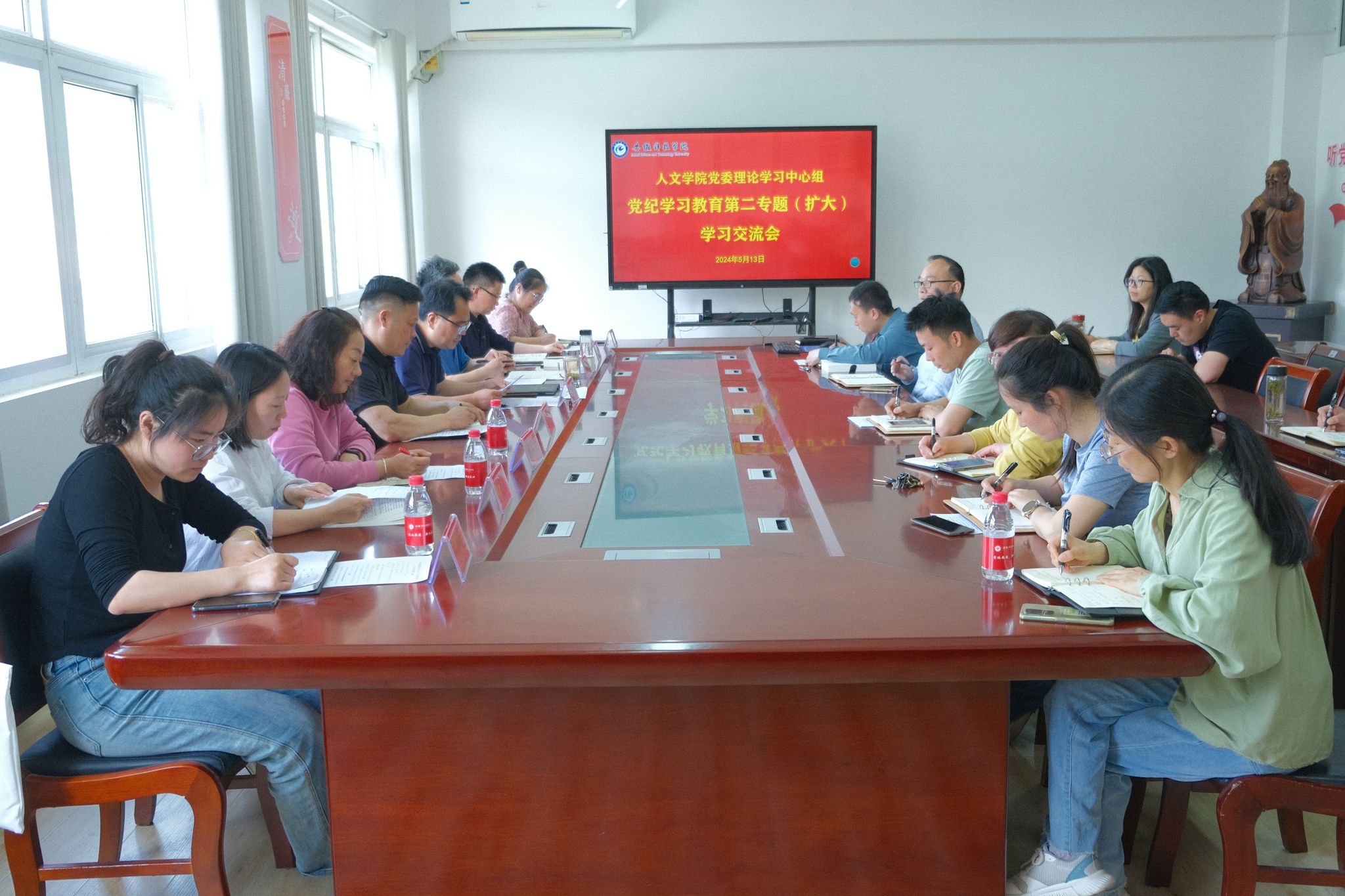 在集中学习阶段,李晓东首先领学了习近平总书记在2024年第9期《求是》杂志上发表的重要文章《组织动员亿万职工积极投身强国建设、民族复兴的伟大事业》和中央纪委国家监委网站5月9日刊载的评论文章《深入学习贯彻习近平总书记关于加强党的纪律教育的重要论述 推动党纪学习教育入脑入心走深走实》;正处级组织员张严政,党委委员、副院长牛永辉,云霁社区支部委员会委员史克芹,党委委员、中文系教工党支部书记和建伟,分别带领与会同志深入学习习近平总书记关于全面加强党的纪律建设的重要论述《重整行装再出发,以永远在路上的执着把全面从严治党引向深入》《一以贯之全面从严治党,强化对权力运行的制约和监督》《自我革命是我们党跳出历史周期率的第二个答案》《坚持不懈把全面从严治党向纵深推进》;党委副书记李沙娜,党委委员、法学系教工党支部书记张晓云逐章逐条领学研读《中国共产党纪律处分条例》分则部分的第6章(对违反政治纪律行为的处分)、第7章(对违反组织纪律行为的处分)共45条原文。