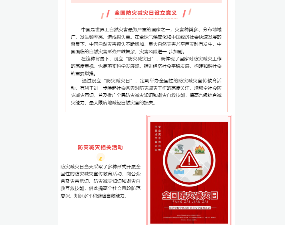 多途径多方式利用网络开展宣传。学院利用易班微社区和轻应用开展防灾减灾宣传,详细介绍了全国防灾减灾日设立的背景、目的和意义、常见灾害类型、急救小知识以及各种安全标识。学生积极参与,踊跃评论,形成人人参与防灾减灾活动的浓厚氛围。