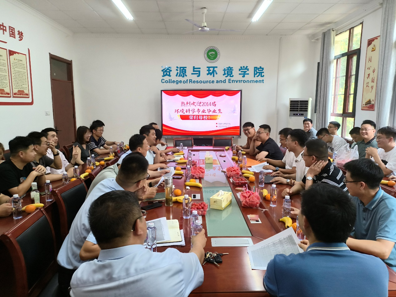下午3时,校友返校师生座谈会在资源与环境学院会议室举行。资源与环境学院院长李孝良,学院党委副书记沈树周,副院长邹海明,副院长李飞跃,人事处副处长谢越,原城建与环境学院院长汪建飞,原城建与环境学院党总支书记、现建筑学院院长张远兵,班主任徐家林,教师代表马万征等出席会议,与返校校友们一同亲切座谈,座谈会由沈树周主持。