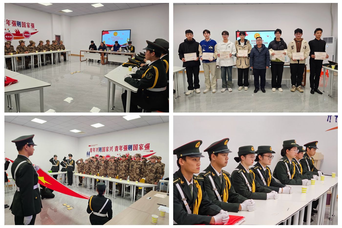 会上,与会老师分别为退役队员、新入职队员颁发了光荣退役证书和新队员聘书并合影留念,宣读了退役队员名单以及聘任第29届新队员名单。第29届校国旗护卫队全体队员进行了入队宣誓仪式,即将退役的老队员代表为新入队队员代表授予军装,校国旗护卫队退役队员代表发表退役感言、新入队队员代表发表入队感言、新一届国旗护卫队骨干代表作了履职表态发言。