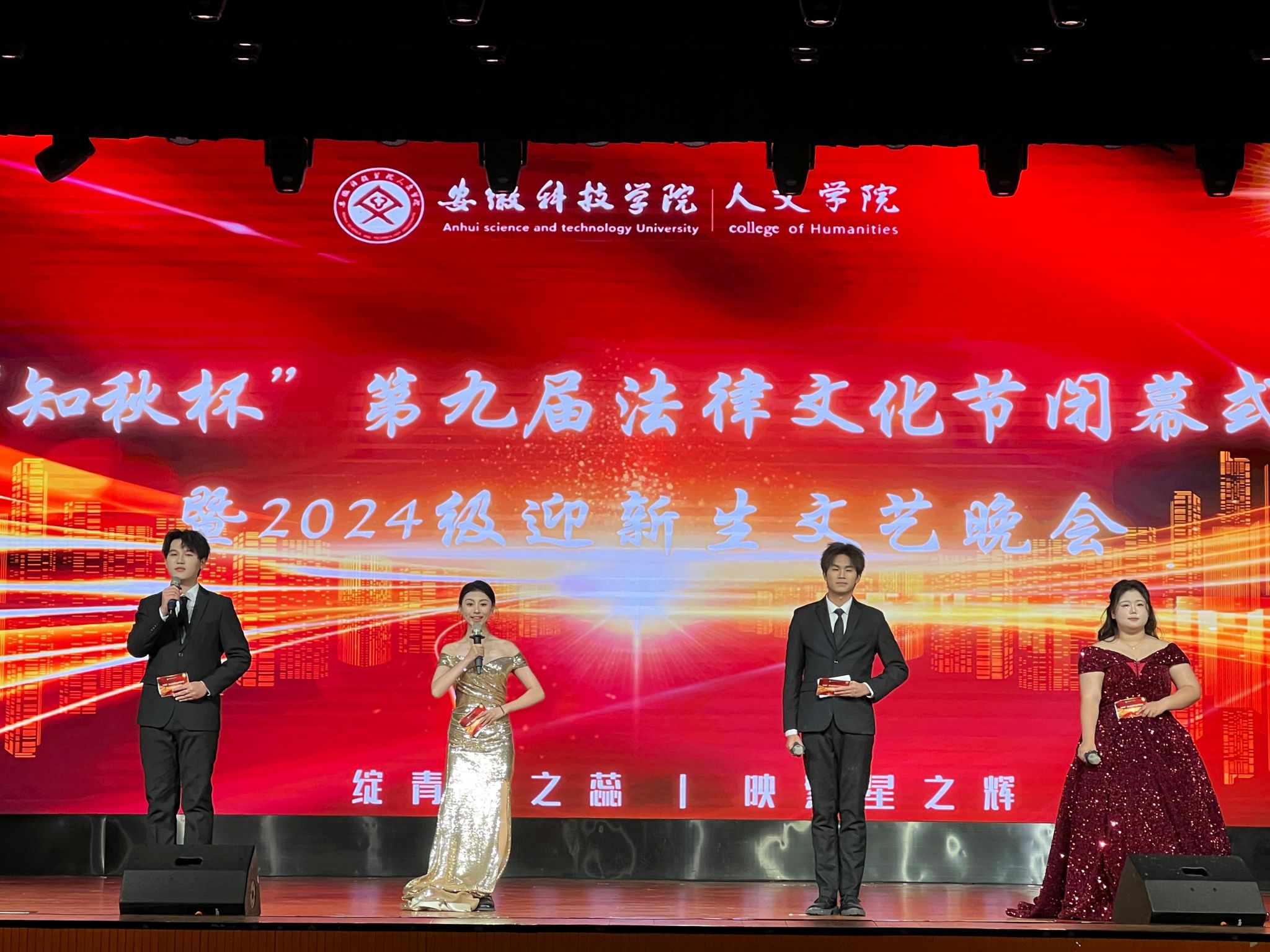 12月7日晚,人文学院在大学生活动中心举办“知秋杯”第九届法律文化节闭幕式暨2024级迎新生文艺晚会。安徽知秋律师事务所主任、首席合伙人宫鉴和执行主任、高级合伙人耿晓兵,人文学院党政领导、教师代表、全体辅导员出席,2024级全体同学和部分老生代表参加。
