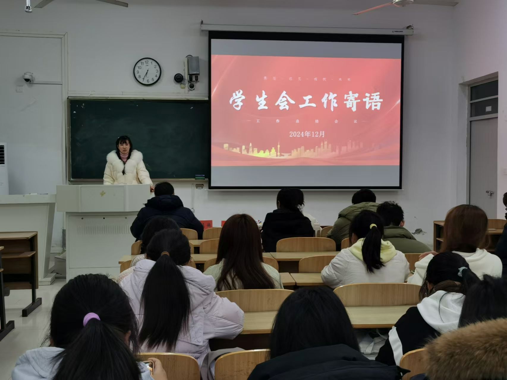 12月20日,财经学院在致知楼c108召开学期末学生会述职评议大会。学院有关教师和学生组织负责人担任评委。学生会全体成员参加述职评议。