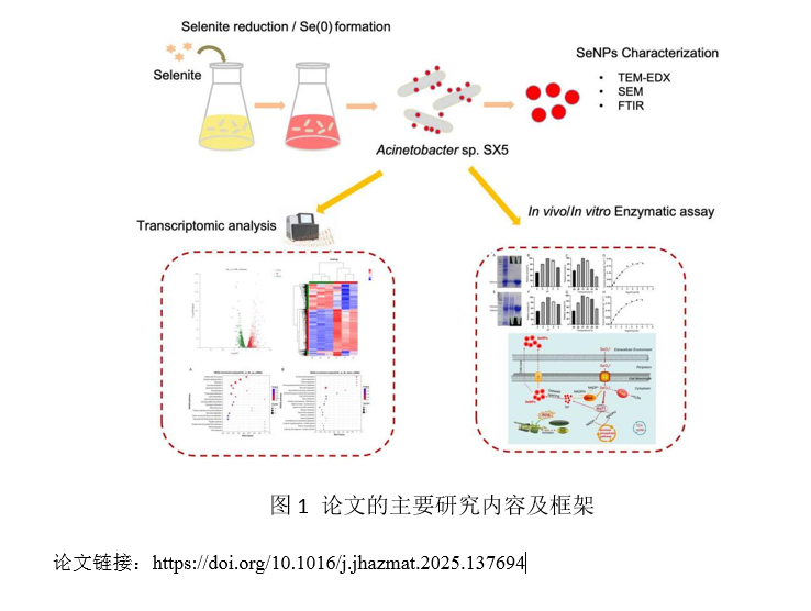 近日,生物医学与健康学院黄胜威副研究员团队及其合作者在纳米硒的微生物合成机制研究方面取得进展。相关研究成果以“Novel mechanisms for selenite biotransformation and selenium nanoparticles biogenesis inAcinetobactersp. SX5 isolated from seleniferous soil”为题,发表在环境领域国际知名期刊《Journal of Hazardous Materials》(中国科学院1区,影响因子12.2)。