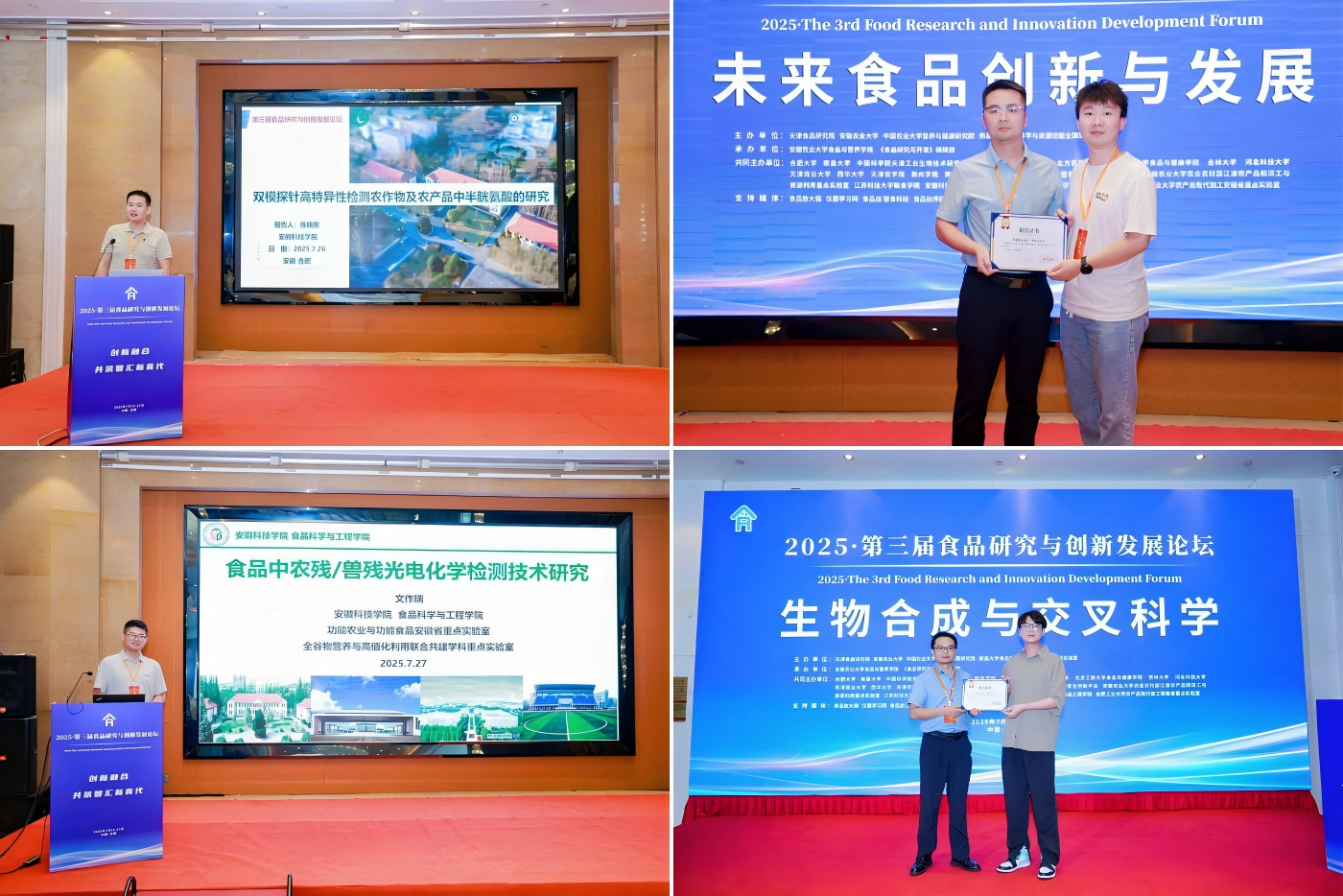 作为共同主办方,开云官方注册食品科学与工程学院深度参与本次论坛,杜传来与翟立公分别担任大会学术委员和执行委员,翟立公主持了食品微生物与肠道健康分论坛,四位青年博士分别在四个分论坛上做了学术报告。陈晓东博士以“双模探针高特异性检测农作物及农产品中半胱氨酸的研究”为题,介绍了其高特异性方法检测半胱氨酸的研究成果;黄明远博士以“表面电荷效应驱动多糖-蛋白互作改善水溶肌原纤维蛋白功能特性”为题,重点揭示了表面电荷效应驱动多糖与蛋白互作机制;文作瑞博士围绕“食品中农残/兽残光电化学检测技术研究”,重点阐述了其通过电化学技术检测农残兽残的关键突破;曾剑华博士以“牛乳αs1酪蛋白构象抗原表位定位及其高效靶向破坏研究”为题,重点介绍了牛乳αs1酪蛋白抗原靶向消减的技术突破及相关研究成果。