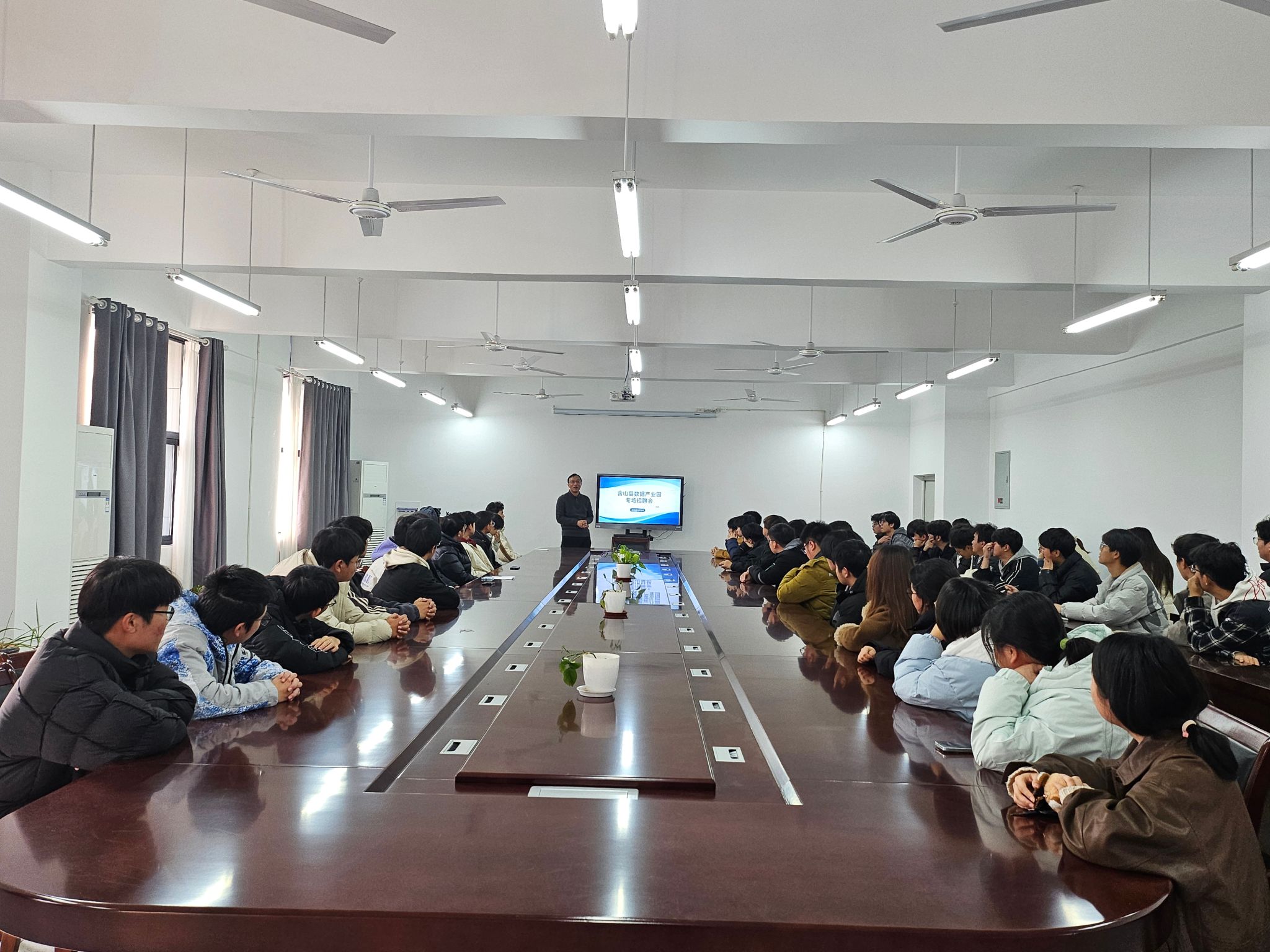 为深化校企合作,拓宽毕业生就业渠道,12月10日下午,信息与网络工程学院在尚行楼B418会议室举办含山县数据产业园专场招聘会。2026届毕业生共60余人参加本次招聘会。