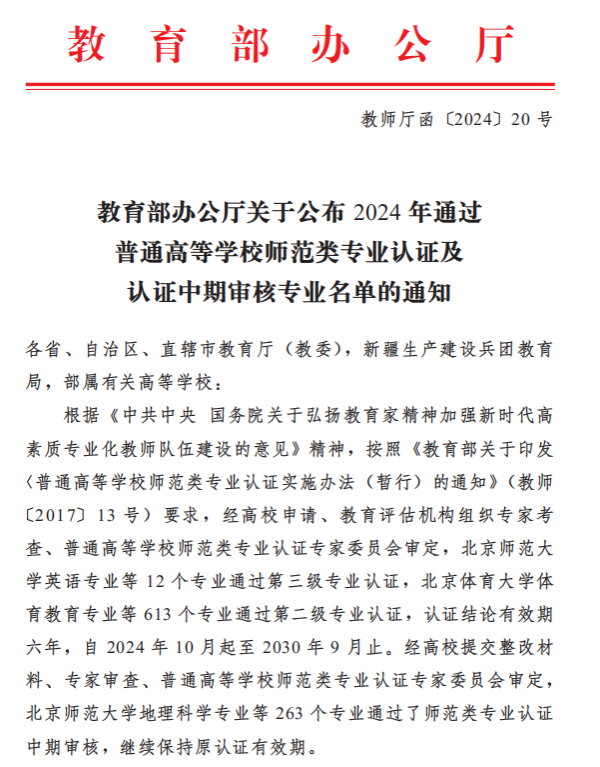 近日,教育部办公厅公布了2024年通过普通高等学校师范类专业认证及认证中期审核专业名单,我校英语专业通过师范类专业第二级认证,认证结论有效期六年(2024年10月至2030年9月)。