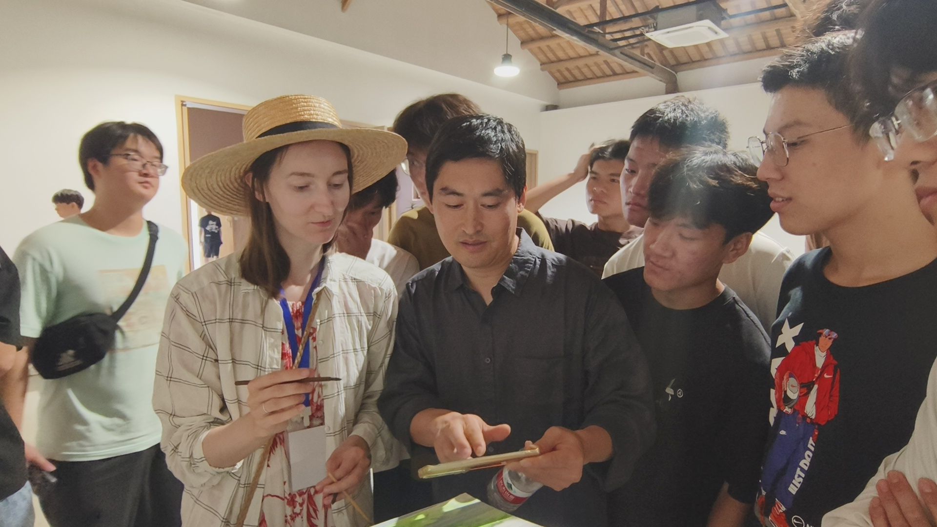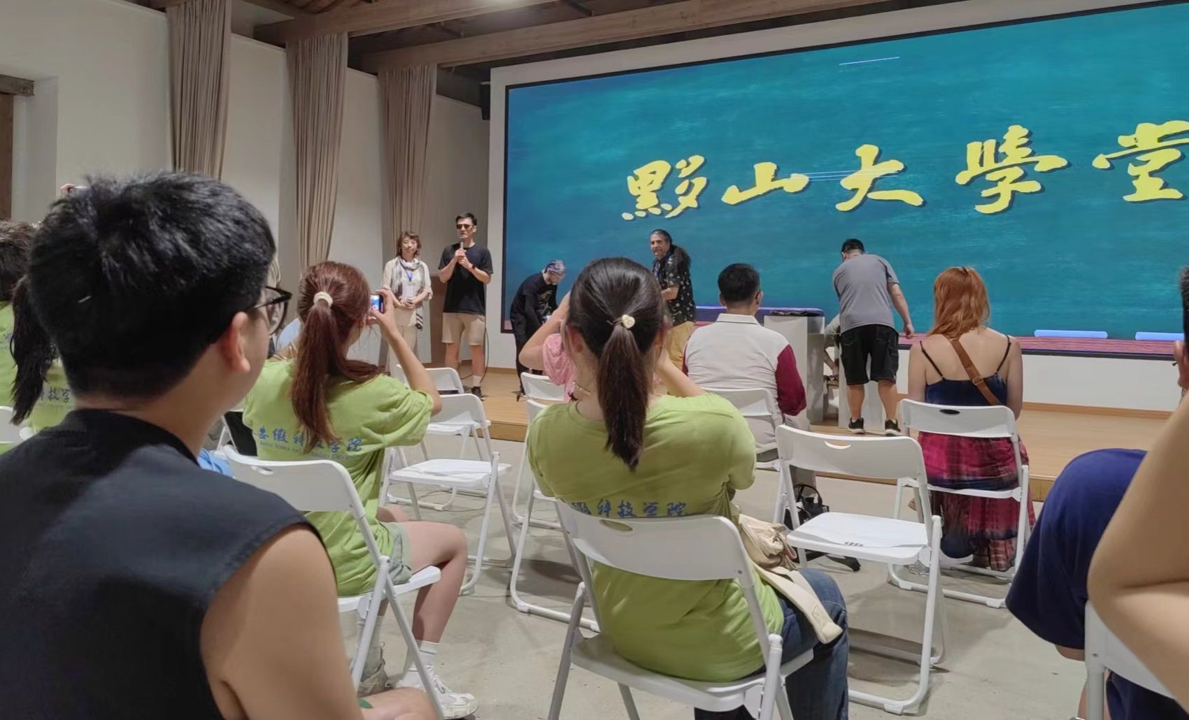 在西递黟山大学堂教室内,建筑学院的师生们与国际艺术家们展开了热烈而深入的交流与探讨。他们围绕作品的创作理念、技法运用以及艺术表现等方面展开了深入的讨论,共同分享彼此的艺术见解和创作心得。这种跨界的交流与合作,不仅为师生们提供了宝贵的学习机会,也进一步拓宽了他们的艺术视野和创作思路。