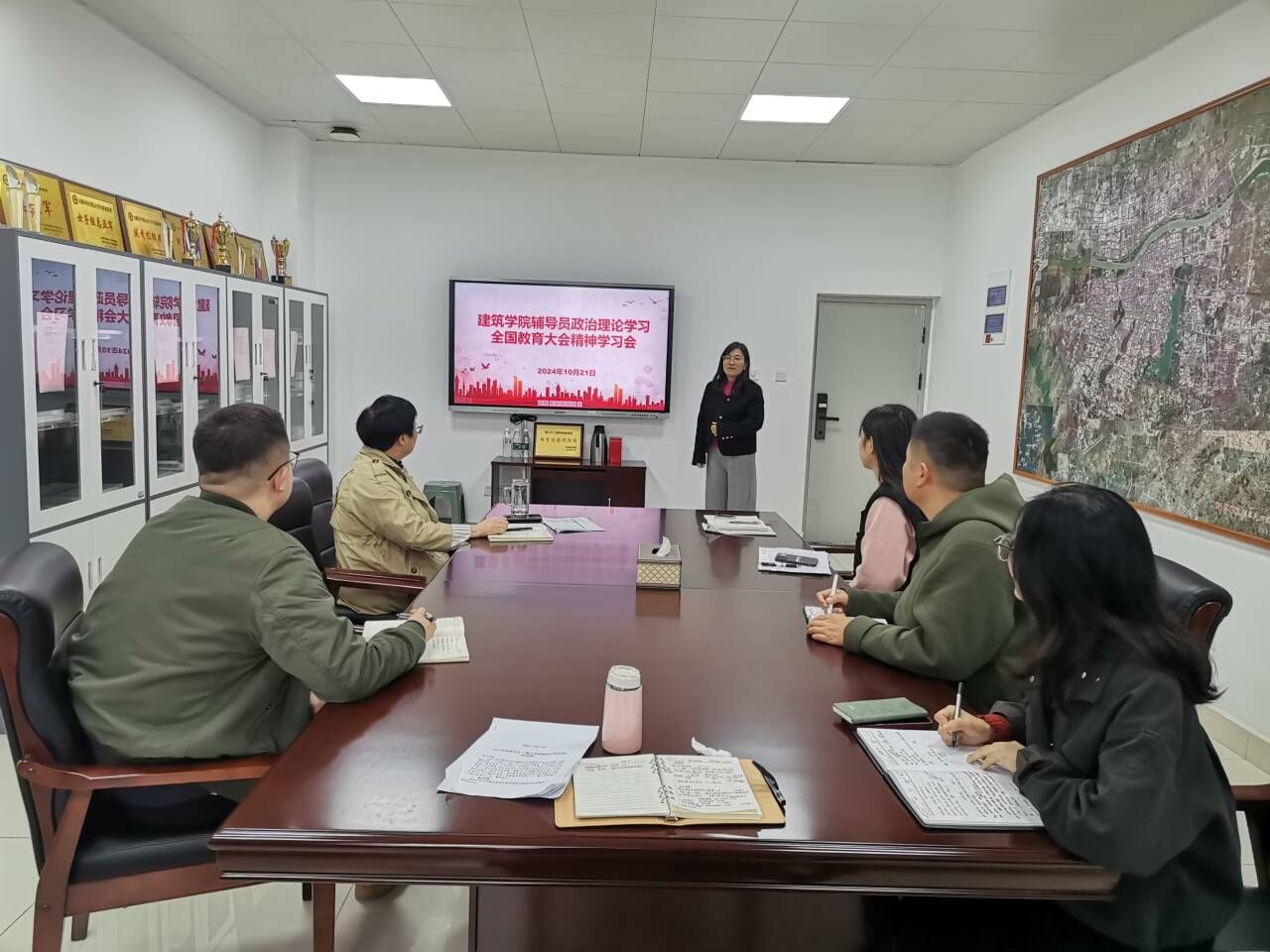 10月21日,建筑学院召开辅导员政治理论学习专题学习会,传达学习全国教育大会精神,学院党政办主任靳盼领学。