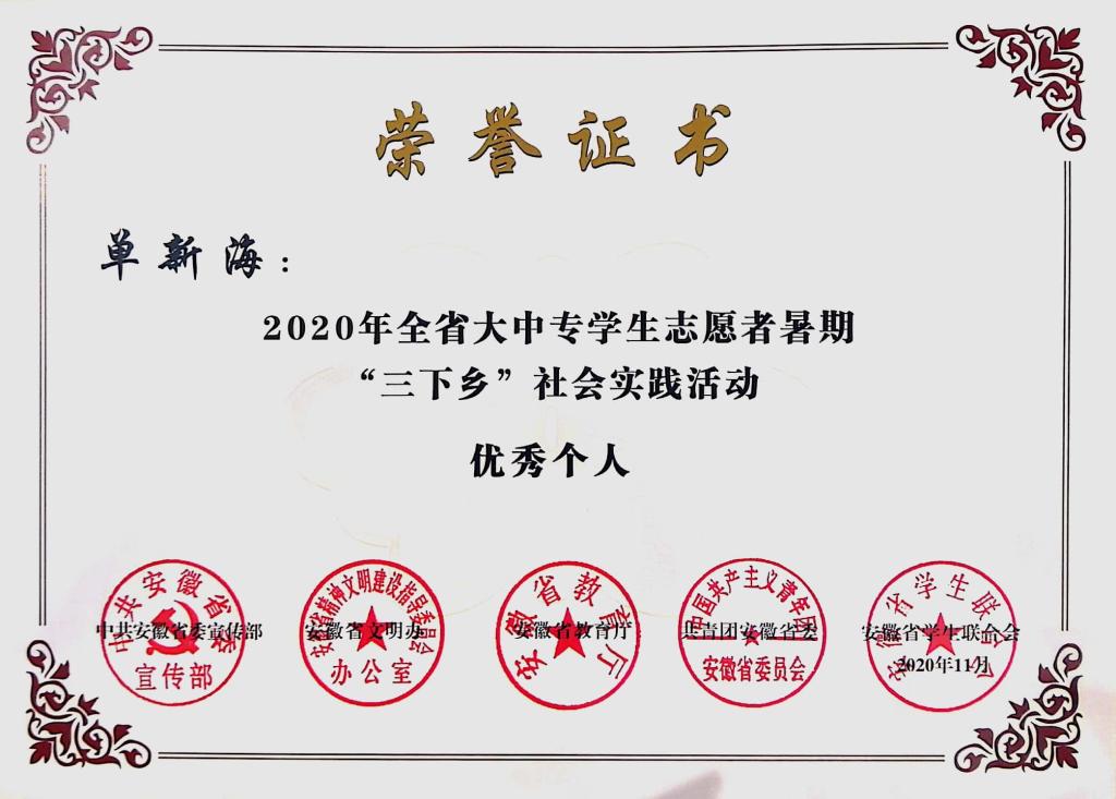事迹简介:单新海,男,民族汉,中共预备党员。任建筑学院团委素质扩展部部长和土木工程183班学习委员。虽家境贫寒,但仍坚强奋斗,完成大学梦,主持参与国家级、省级大创项目2项,并在新冠疫情期间实证分析新冠疫情对合肥市农村地区治理的挑战,撰写调研报告,获国家级奖项。连续2年专业第一,获国家奖学金。具有良好的沟通、协调、组织能力,积极做“带头接种”的践行者,自觉加入志愿者服务队伍,开展党史宣讲活动,社会影响良好,多次被安科小团和学院宣传部采访报道。获评省社会实践先进个人,省优秀共青团员、省向上向善好青年、十佳大学生、挑战杯之星等校级及以上荣誉表彰63次,各方报道总浏览量达3万余次,是当代青年“可亲、可信、可学”的先进典范。