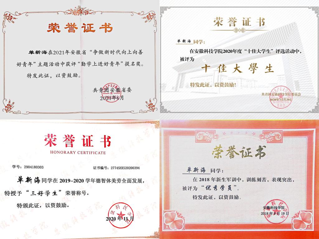 单新海父亲患有脑梗死、母亲腰间盘突出,腿部手术,家境贫寒加上自身心脏不好让他的求学之路比普通人更加艰辛,但是他仍不放弃学业,以乐观积极的态度面对挫折,克服重重困难,实现大学梦,大学入学至今,单新海连续两年获得专业双第一以及校一等优秀学生奖学金,校三好学生等荣誉,更是于2019年获得国家励志奖学金,2020年获得国家奖学金,为身边同学树立了模范作用。
