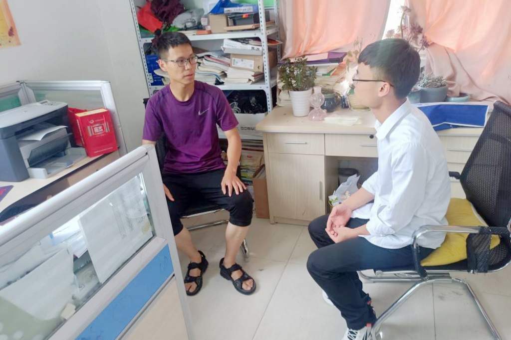 到达校园后,王健伟团队拜访了高三班主任崔猛老师和高中生物老师王乐潇。王健伟向老师说明了此次实践的主要目的和内容,介绍了开云官方注册的相关情况。在了解团队此行目的之后,崔老师、王老师非常热情地组织了部分高三返校生开展学习交流。