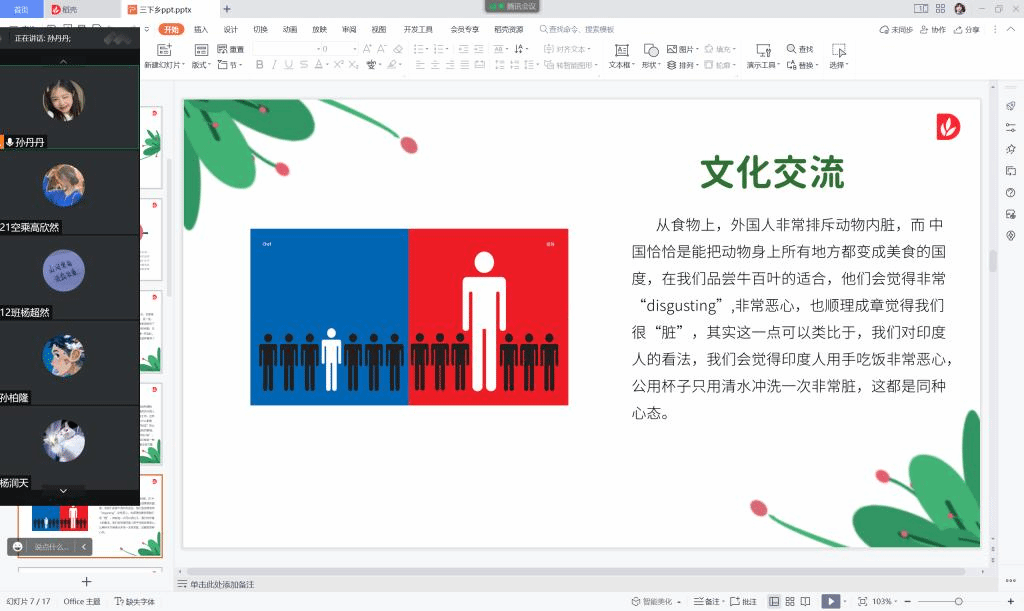 实践团队成员孙丹丹面向当地大学生采用了线上PPT讲解的方式,开展了加强大学生开放意识主题宣讲。活动中,孙丹丹以热身活动——“拒绝刻板印象,拥抱健康心灵”拉开序幕,围绕 “刻板印象的影响”、“如何保持政治坚定、思想开放”以及“如何弘扬开放精神,开创多彩人生”等内容进行了详细讲解,引导参会人员打破固有思维定势。