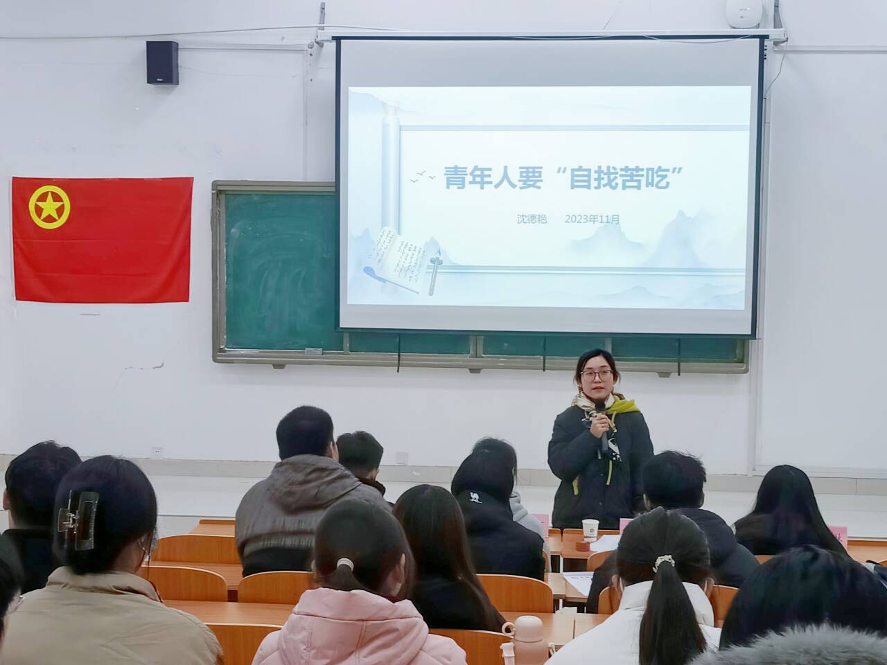 沈德艳以“青年人要‘自找苦吃’”为题,分别从“乐于吃苦的干劲”、“善于吃苦的本领”、“敢于吃苦的担当”三个方面进行讲解,带领学生解读习近平总书记给中国农业大学科技小院同学们的回信,“当代青年,要有自找苦吃的精神,要乐于吃苦,善于吃苦,敢于吃苦,在‘自找苦吃’中千锤百炼”。她表示乐于吃苦是一种境界,在干事创业中实现价值,体验快乐,以“功成不必在我”的心态,主动作为,才能感受到真正在干事、成事中获得的自信心和满足感。善于吃苦是一种能力,从艰苦奋斗中汲取精神力量,不断砥砺品质、增长才干,练就一身吃苦本领。敢于吃苦是一种考验,要想炼就“吃苦”本领,就要在学思践悟中坚定理想信念,在实干担当中践行初心。