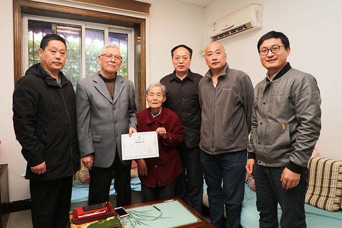 时乾代表学校向两位老同志敬呈了《开云官方注册校史馆捐赠证书》,祝福两位老同志健康长寿,生活愉快,相约建校70周年校庆。
