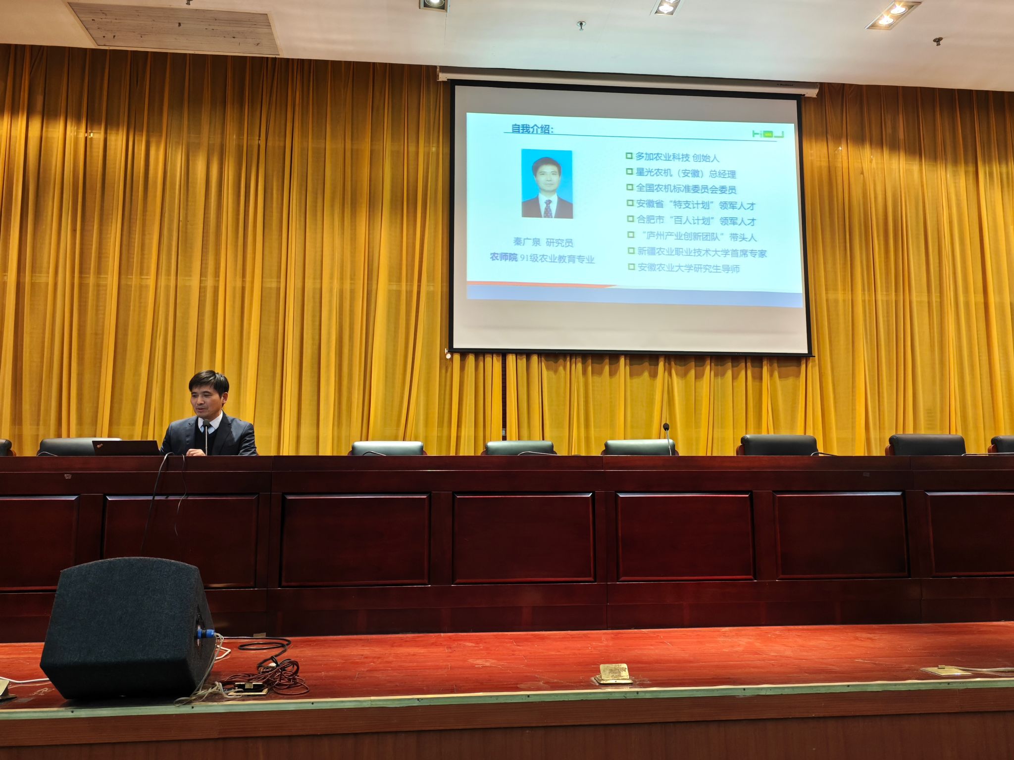 秦广泉是我校农学院93届毕业生,现为合肥多加农业科技有限公司总经理。秦广泉讲述了当前全国大学生的就业形势,介绍了当代智慧农业对大学生就业创业带来的机遇和挑战。同时回忆了自己的创业经历。秦广泉原有一份稳定的工作,他在农业技术推广中善于学习,勇于探索和钻研农业信息技术,发现和找到国外农药使用的新技术,发达国家农作物产量逐年提高,农药使用不断减少的关键科学技术。决定自筹经费从植保机械的研发入手,组建团队,设计方案。经多年实践和技术创新,研制出用药少,产量高的多种植保智能机械,深受农业科技和推广部门的重视,其智慧农业覆盖安徽、新疆、甘肃、海南等地,先后承担省市重点研发项目,创制先进的农机装备60余种,多次在国家、省机器人创新创业大赛中获奖,被农业科研部门破格聘为研究员,获安徽省智慧农业创新领先人才等荣誉。