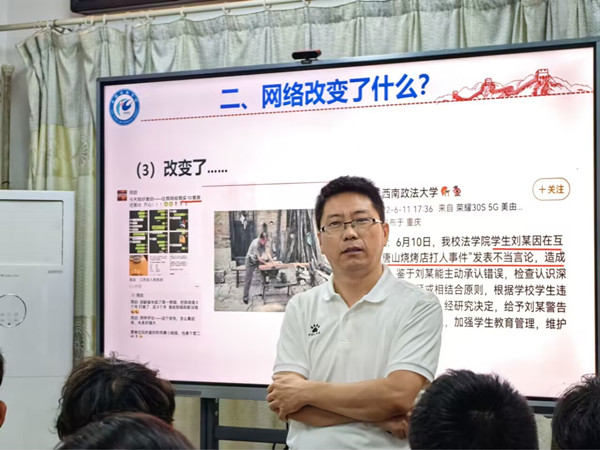 在辅导员张轶辉的带领下,同学们先是对当今时代特征展开深度研讨,班会氛围活跃,同学们积极参与,对这个日新月异的时代有了更全面的认知。接下来,张老师以“网络的时代特征”“网络所带来的改变”和“网络时代我们该怎么做”等三个方面进行了讲解。