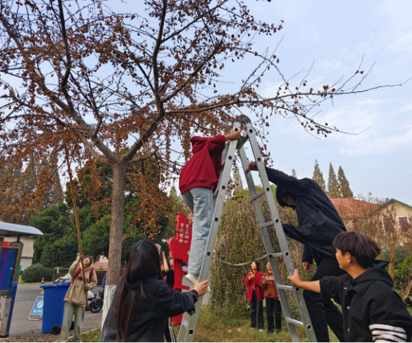 11月22日,园艺专业同学在辅导员吴荡的指导下,对校园内银杏树采取了疏果救治,以维持银杏树的健康生长,守护校园绿化。