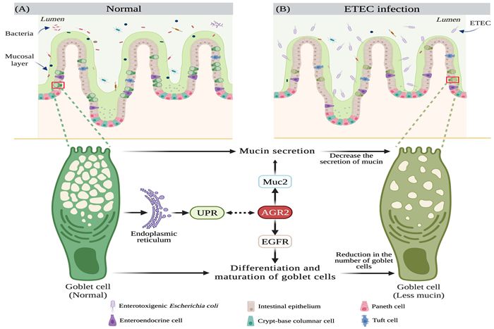 仔猪早期断奶产生的断奶应激使其肠黏膜屏障受损,易诱发多种细菌性肠道疾病,产肠毒素大肠杆菌(ETEC)被认为是引起仔猪断奶后腹泻的主要原因。该篇综述论文关注ETEC感染后,仔猪肠道出现杯状细胞数量减少、粘蛋白分泌减少、粘液层变薄等现象,分析了维持肠道细胞内质网稳态的重要响应蛋白前梯度蛋白2(AGR2)在参与未折叠蛋白反应(UPR)信号通路级联反应中的关键作用,提出AGR2特异性结合表皮生长因子受体(EGFR)和粘蛋白2(MUC2)进而调控杯状细胞分化、成熟和粘蛋白合成和分泌,影响杯状细胞的数量和粘液层的完整性,调控ETEC感染所致的断奶仔猪肠黏膜屏障损伤修复的分子机制。