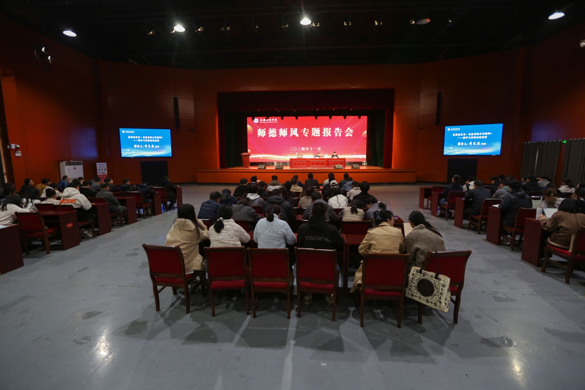 11月20日下午,学校在凤阳校区大学生活动中心举办师德师风专题报告会。全国模范教师农学院黄先忠教授应邀作题为《怎样成长为一名优秀的大学教师—教学与科研如何兼得》的专题报告。2020年以来新进教师参加报告会,报告会由党委教师工作部副部长、人事处副处长唐婧主持。