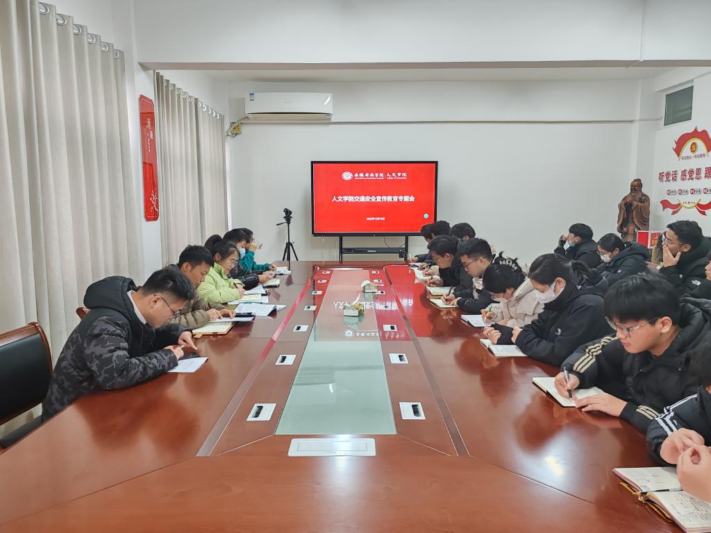 12月15日下午,人文学院在学知楼324召开交通安全宣传教育专题会议,学院党委副书记李沙娜、全体辅导员及各班班长、学习委员参加,会议由学院团委副书记焦雪松主持。