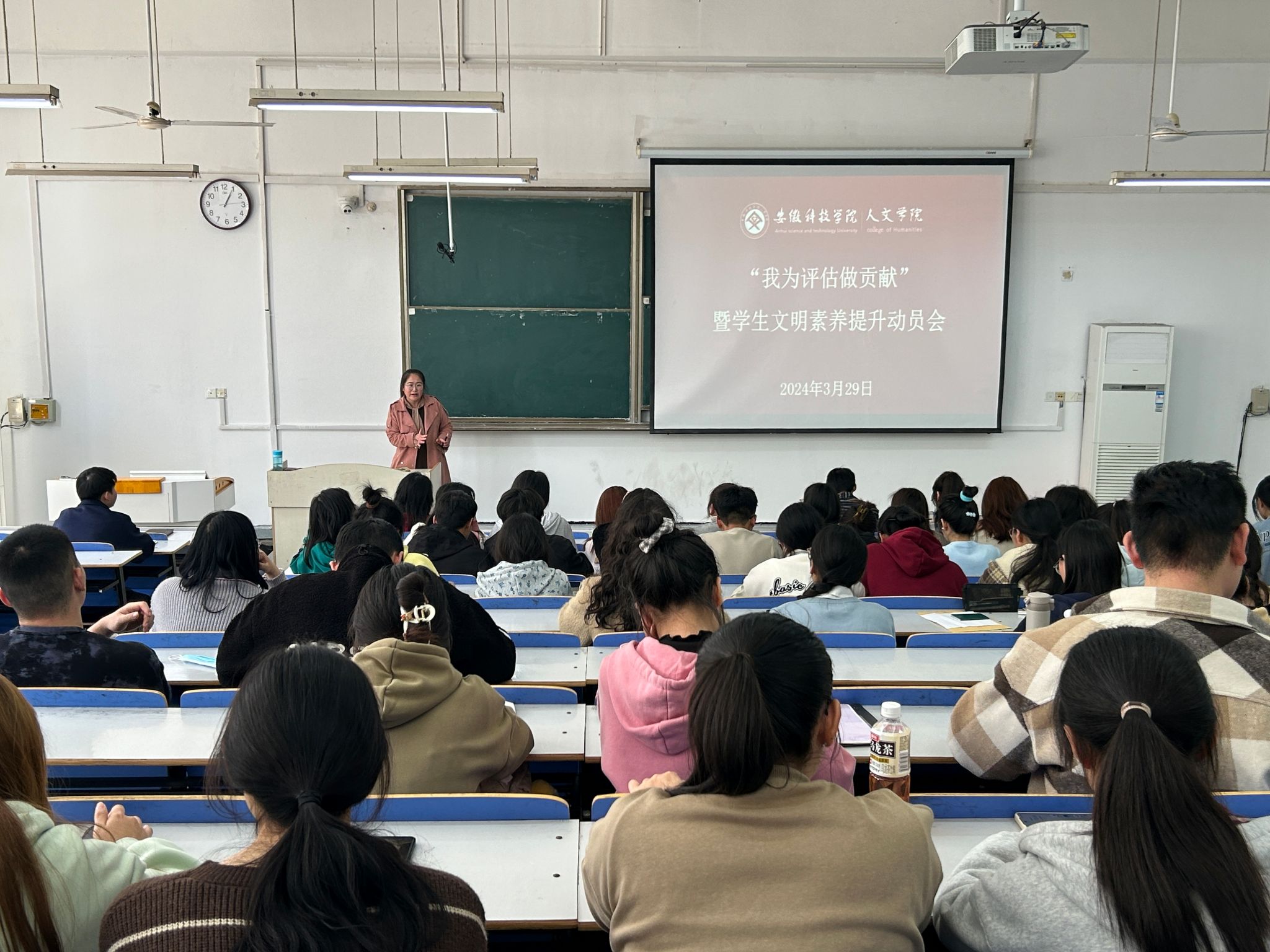 为切实做好新一轮本科教育教学审核评估迎评工作,帮助学生深入学习了解审核评估基本知识,进一步提高对审核评估重要性的认识,提升基础文明素养,3月29日中午,人文学院在求知楼A106教室召开“我为评估做贡献”暨学生文明素养提升动员会。学院党委副书记李沙娜、全体辅导员、学生党员和各班级主要班委参加。动员会由学院团委副书记焦雪松主持。