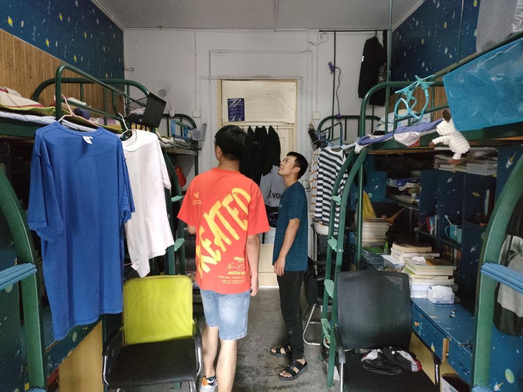 老师们一行每到一间宿舍,仔细查看宿舍环境卫生和安全情况,并与学生亲切交谈。检查过程中,询问了同学们暑期学习及生活情况。并叮嘱同学们疫情防控期间,务必重视宿舍卫生问题并及时进行整改,夏季要注意用电安全,杜绝使用大功率电器。在此期间还对外宿学生居住点进行实地走访检查。从检查情况看,暑期留校学生在老师们的倡议动员下积极行动,整体卫生情况良好,无违规用电情况。但有少数宿舍仍出现垃圾清理不彻底、物品摆放不整齐等问题。针对排查中发现的问题,各位老师及时指明,并现场督促整改。