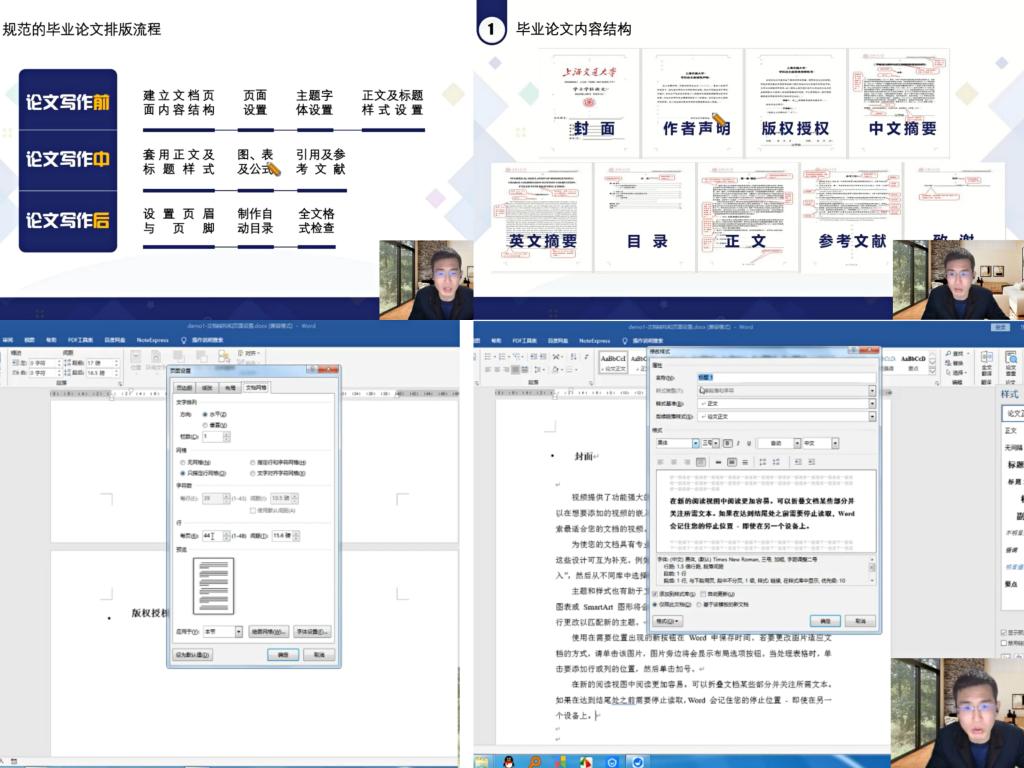 主讲人主要围绕六个方面进行了阐述,一是整体设置:包括整体页面、页码的设置等,二是封面及作者声明,三是摘要与关键词,四是正文与目录:包括正文格式、不同级别标题的设置,自动目录生成与公式、图、表的设置等,五是参考文献格式设置:包括百度学术引用、知网引用、NoteExpress引用等,六是致谢与模板的保存、使用。