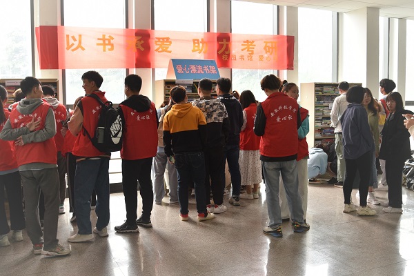 4月24日上午,图书馆联合校爱心社在凤阳校区图书馆2楼休闲平台共同开展了“以书承爱,助力考研”为主旨2021年爱心漂流书架”活动启动仪式。