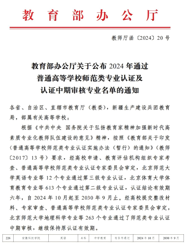 近日,教育部办公厅公布了2024年通过普通高等学校师范类专业认证及认证中期审核专业名单,我校英语专业通过师范类专业第二级认证,认证结论有效期六年(2024年10月至2030年9月)。