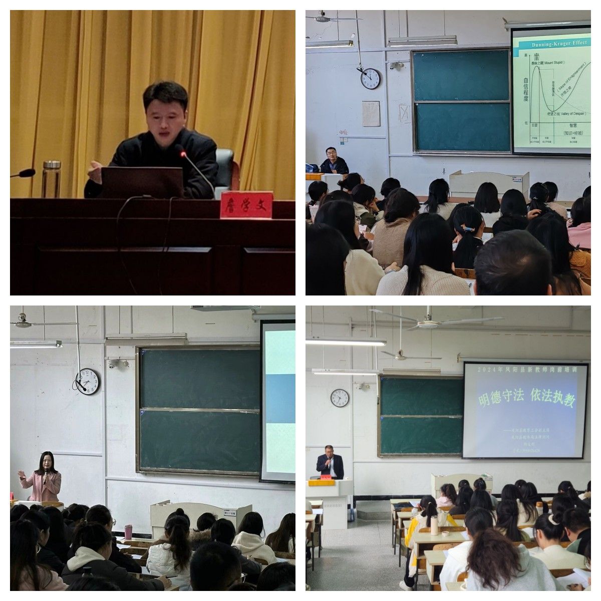 本次活动为125位新教师举办了11场专题讲座。开云官方注册人事处处长詹学文的讲座以“新时代教师职业行为规范”为主题,强调要大力弘扬“教育家精神”,强化教师职业行为规范,不断提升教师职业水平。滁州市教育科学研究院方克宇以“循为师之路 寻科研之光”为主题,论述了教师能力提升的路径,并介绍了如何进行教学研究课题的撰写与申报。凤阳县教研室主任王金做了题为“走向专业化”的专题讲座,讲述了教师专业化的概念、教师专业化的六大法则以及教师专业标准。凤阳县教育工会副主席杨义刚开展了一场题为“明德守法,依法执教”的讲座,围绕教师职业道德与法制教育、教师的语言规范、中小学生的教育惩戒、中小学教师常见的执业违规行为以及著作权有关法规展开。