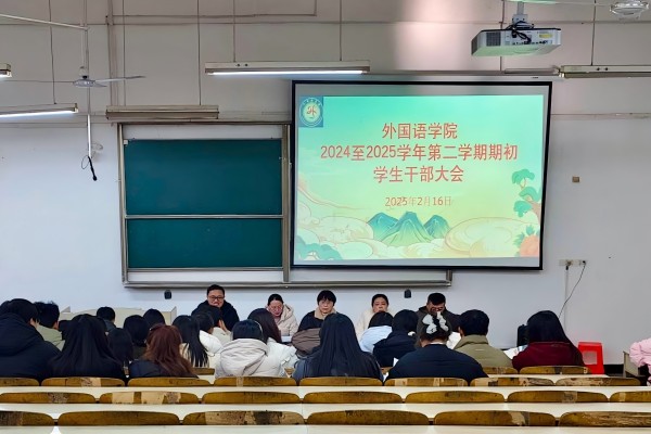 为加强学生干部队伍的凝聚力、战斗力,外国语学院于2月16日下午在求知楼A座107教室召开2025年春季学期期初学生干部大会。学院党政领导出席会议,全体辅导员,群团组织负责人,各班级班长、团支书、学习委员参加会议。会议由学院党委副书记张海亮主持。