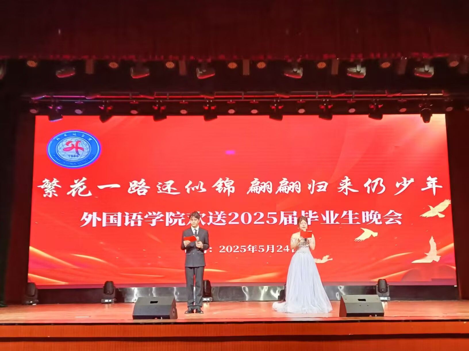 5月24日晚,外国语学院“繁花一路还似锦,偏偏归来仍少年”欢送2025届毕业生晚会在校大学生活动中心隆重举行。学院党政领导、教师代表及全体学生共同见证了这一温情时刻。