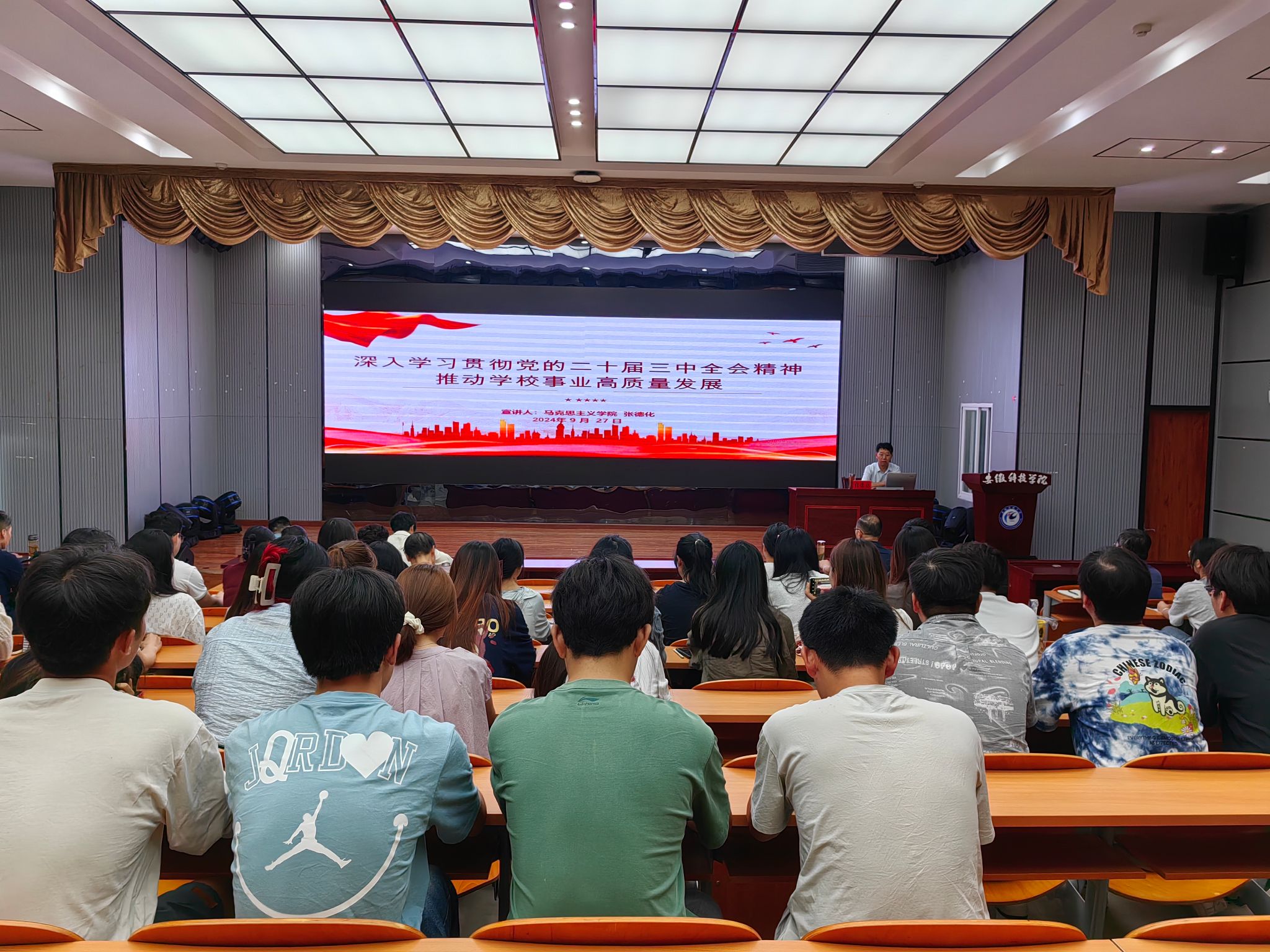 9月27日上午,党委委员、副院长王孝义在凤阳校区会议中心第一报告厅宣讲党的二十届三中全会精神。动物科学学院、外国语学院师生党员和科研处、人事处、研究生处、国有资产管理处、基建管理处、后勤保障部、资产经营部等单位教职工代表共120余人参加宣讲会。