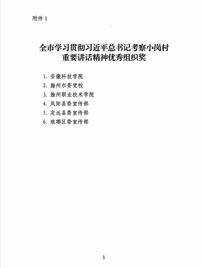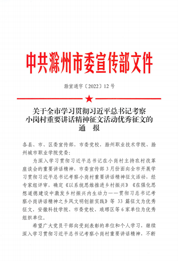 日前,滁州市委宣传部发布《关于全市学习贯彻习近平总书记考察小岗村重要讲话精神征文活动优秀征文的通报》(滁宣通字〔2022〕12号),我校在此次征文活动中荣获优秀组织奖(排名第一),四篇文章获评优秀征文。