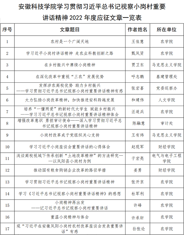 自征文活动开展以来,学校积极谋划,各单位协同配合,认真组织动员广大师生积极参与。经学校遴选、滁州市委宣传部组织专家评审,最终我校农学院王佳慧同学的《农村是一个广阔天地》、农学院甄凤贤老师的《学总书记小岗讲话精神走农业科教创新之路》、马克思主义学院贾卫东老师的《在乡村振兴中赓续小岗精神》、基建管理处呼志鹏老师的《在深化改革中重视“三农”发展优势》等四件作品荣获优秀征文。