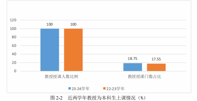 承担本科教学具有教授职称的教师有 122 人,以学校具有教授职称教师 122人计,主讲本科课程的教授比例为 100%。